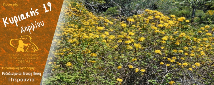 Το κίτρινο ροδόδεντρο είναι ένας θάμνος που στην Ελλάδα απαντάται μόνο στην Δυτική Λέσβο, βάφοντας αυτή την εποχή με έντονο κίτρινο χρώμα τις ρεματιές του δάσους της μαύρης πεύκης. Τοξικός και με παραισθησιογόνες ιδιότητες, αλλά πανέμορφος και με έντονο άρωμα, θα δώσει ιδιαίτερο χρώμα στην πεζοπορία αυτής της Κυριακής.